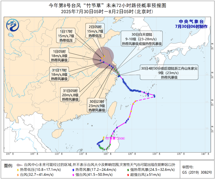 今年第8号台风“竹节草”(热带风暴级)的中心已于今天(30日)早晨4时30分前后在浙江省舟山市朱家尖岛沿海登陆,登陆时中心附近最大风力有9级(23米/秒),中心最低气压为975百帕。早晨5点钟其位于浙江省舟山市近海海面上,就是北纬29.8度、东经122.2度,中心附近最大风力有9级(23米/秒),中心最低气压为975百帕,七级风圈半径100-300公里。